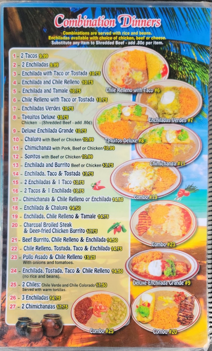 Main Dishes and Burritos: Specialty items like carne asada burritos, char-broiled chicken burritos, and chimichanga dinners are part of the menu. These are often served with traditional sides such as rice and refried beans.