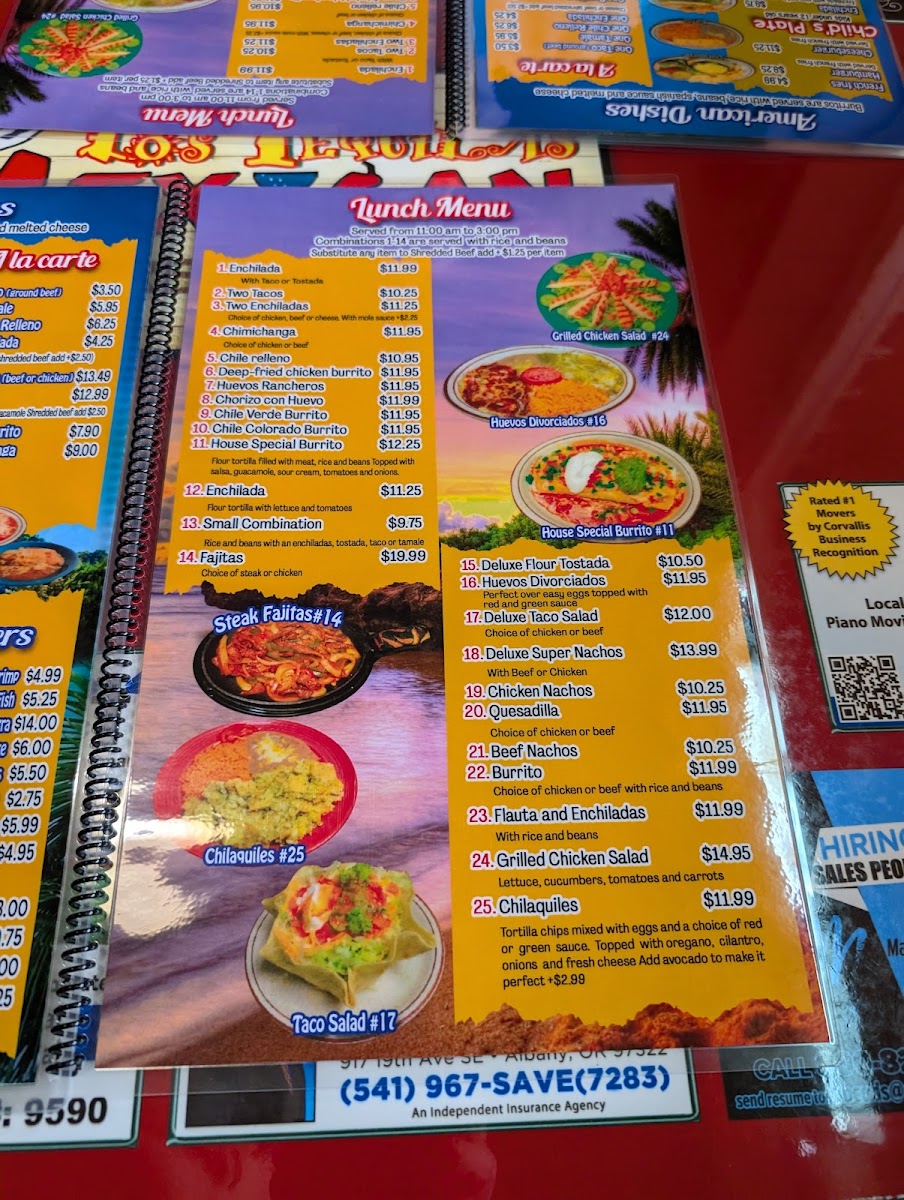 The menu offers a variety of traditional Mexican and Latin American dishes suitable for lunch and dinner. It features several main categories including tacos, fajitas, burritos, salads, and side orders, providing a range of options for different preferences.